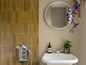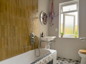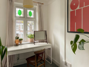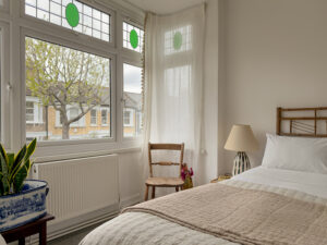 Upstairs, the rear of the property overlooks a quiet, leafy stretch of neighbouring gardens, creating a wonderful sense of light, privacy and calm. There are two spacious double bedrooms, a third bedroom, and a family bathroom finished in warm ochre tones, with both bath and shower.