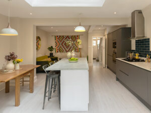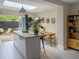 To the rear, the house opens into an impressive open-plan kitchen, living and dining space of over 350 sq ft. Designed for both everyday living and entertaining, this space accommodates a large kitchen with island, dining area and relaxed seating zone. Bifold doors open directly onto the east-facing garden, creating a seamless connection between indoors and out. A separate WC completes the ground floor.