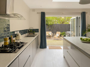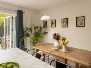 The ground floor has been carefully designed to maximise both space and flow. A gated front garden, laid with original mosaic tiles and framed by raised beds, is anchored by a mature Japanese aralia, providing year-round greenery and a welcome sense of privacy.