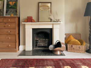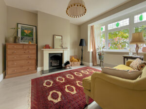 On entering the house, there is a practical area for coats and shoes. To the right, a generous sitting room enjoys views over the front garden and features a striking original marble fireplace.