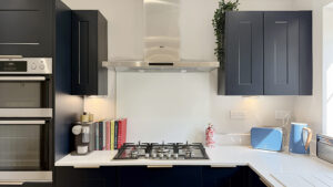 The ground floor has been thoughtfully designed for modern living, featuring a separate front reception room with shutters, guest WC and useful built-in storage. To the rear, a generous open-plan kitchen, living and dining space forms the heart of the home, complete with an integrated fridge freezer, gas hob and excellent workspace. A separate utility room houses both a washing machine and dryer, keeping the main space clean and functional. Full-width bifold doors open directly onto the garden, creating a seamless indoor–outdoor connection, with the added benefit of side access. Off-street parking is also included. Full under floor heating throughout the ground floor